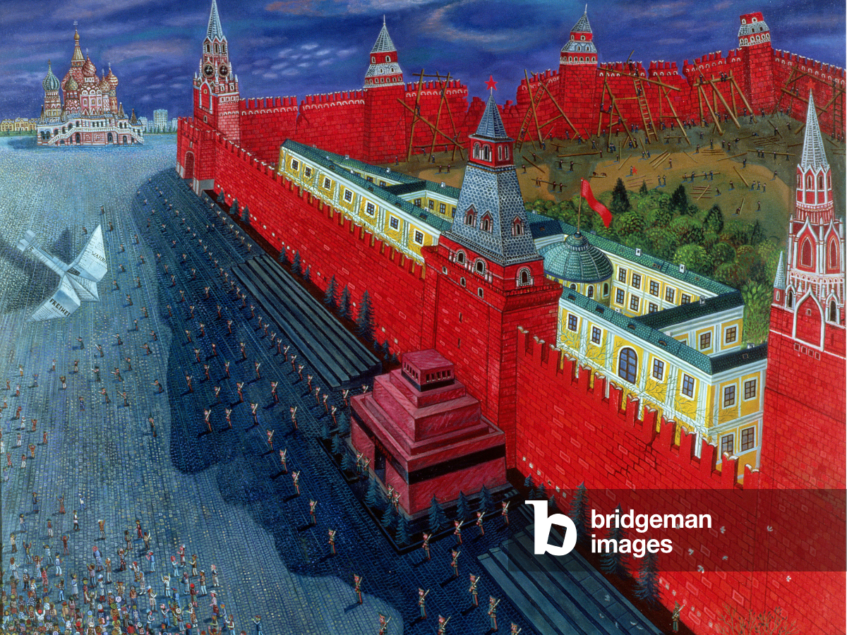 Unlike many artists, Tamás Galambos often includes hidden meanings in his work. One example is within Red Square (1988) (seen above), a painting that references a little-known Cold War incident. In 1987, a young German pilot, Mathias Rust, made headlines when he illegally flew a small aircraft into Soviet airspace and landed in Moscow’s Red Square. Rust claimed to be attempting to reduce tension between the two Cold War sides. The overarching Red building within the painting illustrates the Kremlin building, with the addition of Lenin's tomb, marked with his name inscribed on the black stripe. This subtle detail reveals Galambos’ layered approach to storytelling through art.
